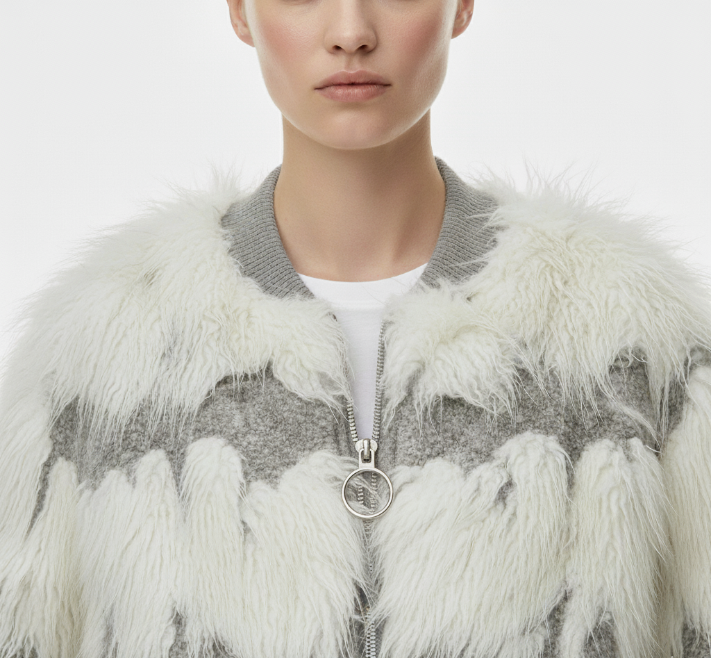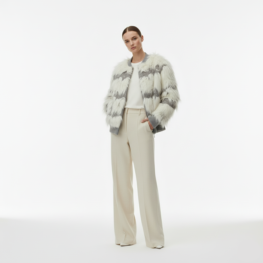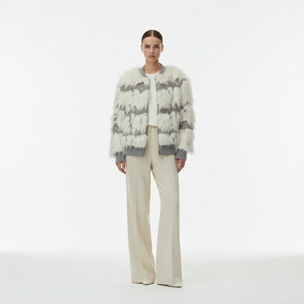 Şık, gri ve krem çizgili, yumuşak, dokulu sakallı/kürk görünümlü üretilen bu bomber hırka, rahat ama sofistike bir silüet sunar. Fitilli manşetler ve yaka, klasik spor giyim kontrastı ekleyerek onu ister dar paça pantolonlarla, ister favori kotlarınızla eşleştirmek için mükemmel kılar.